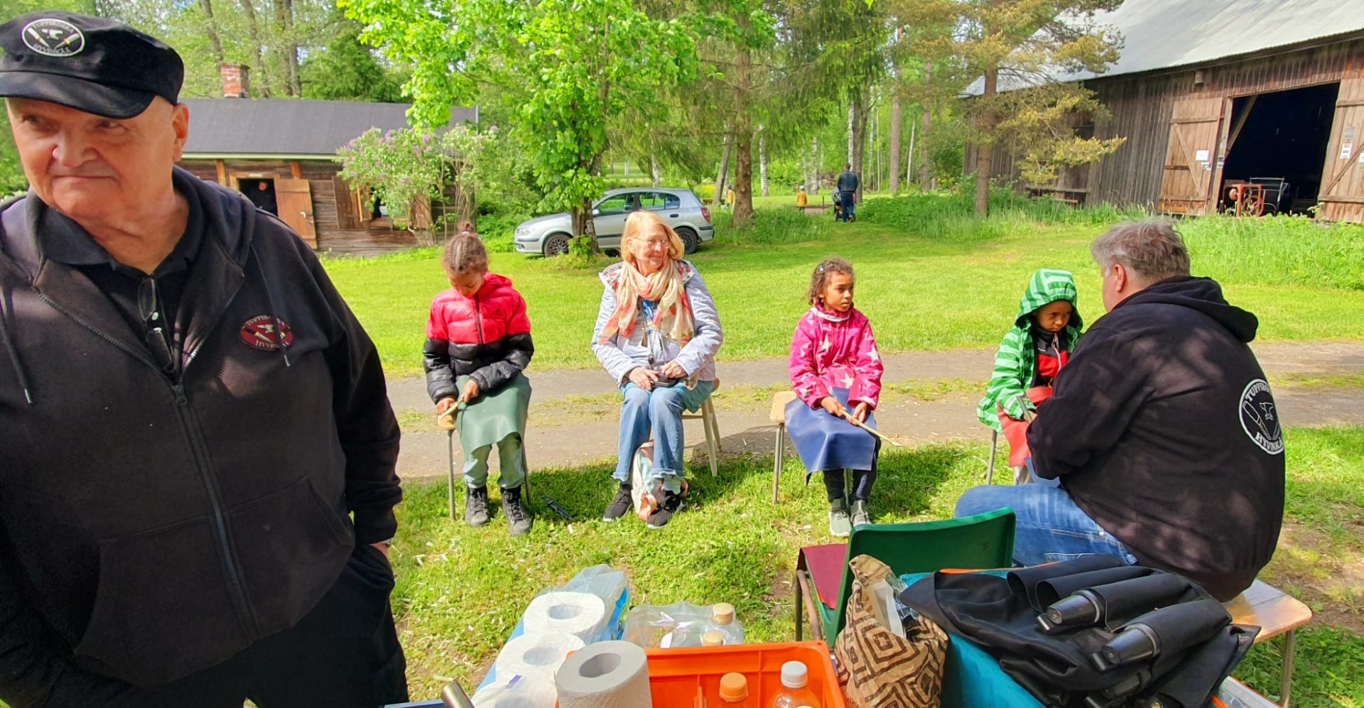 Alakuvassa hyvinkääläisen "Tuppiroska" -seppäryhmän koulutusta puukkojen oikeaan käyttöön, tuotoksena pajupilli!