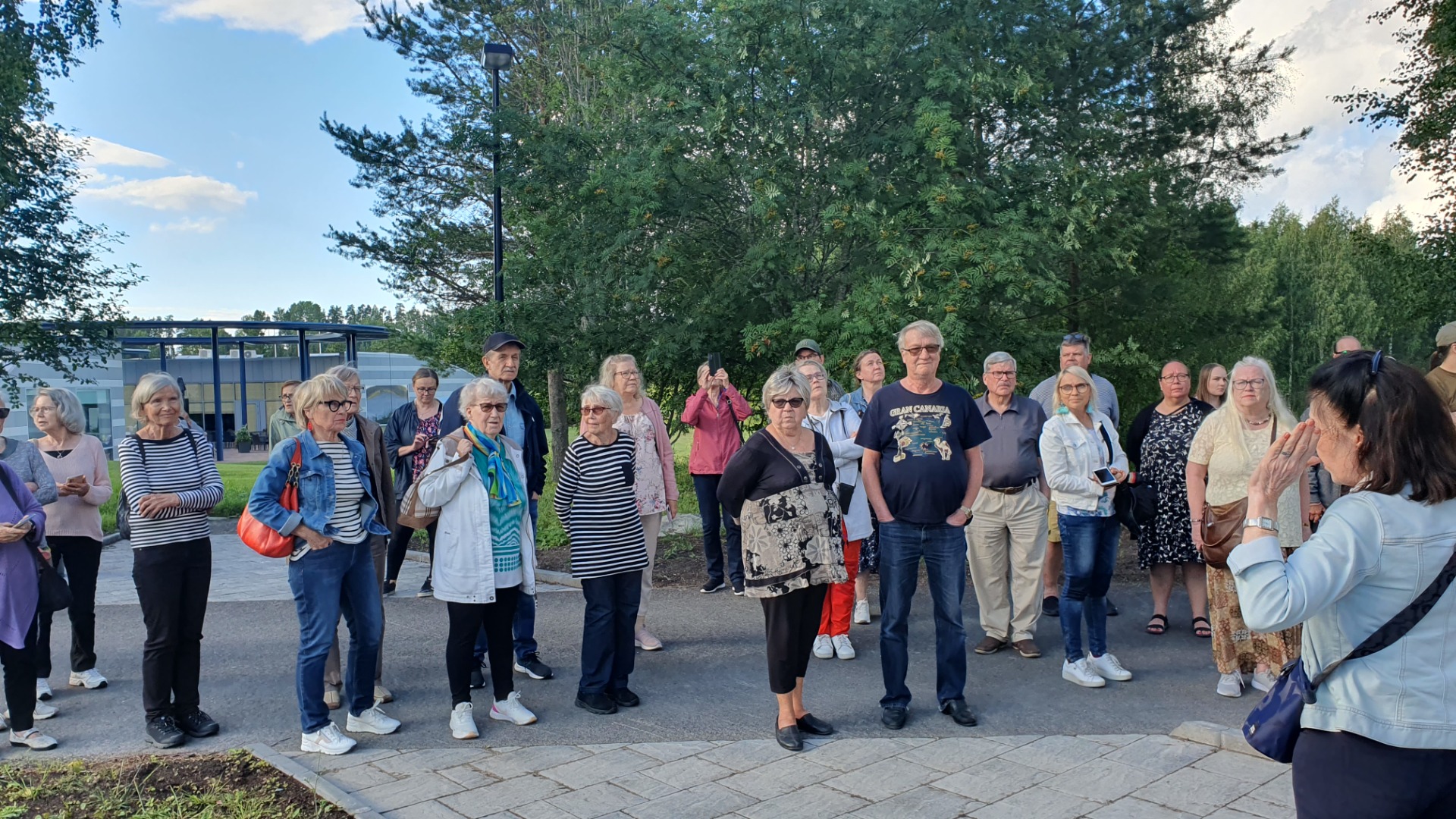 Retkeläisiä tutustumassa Ahdenkallion kartanoon elokuussa 2023.